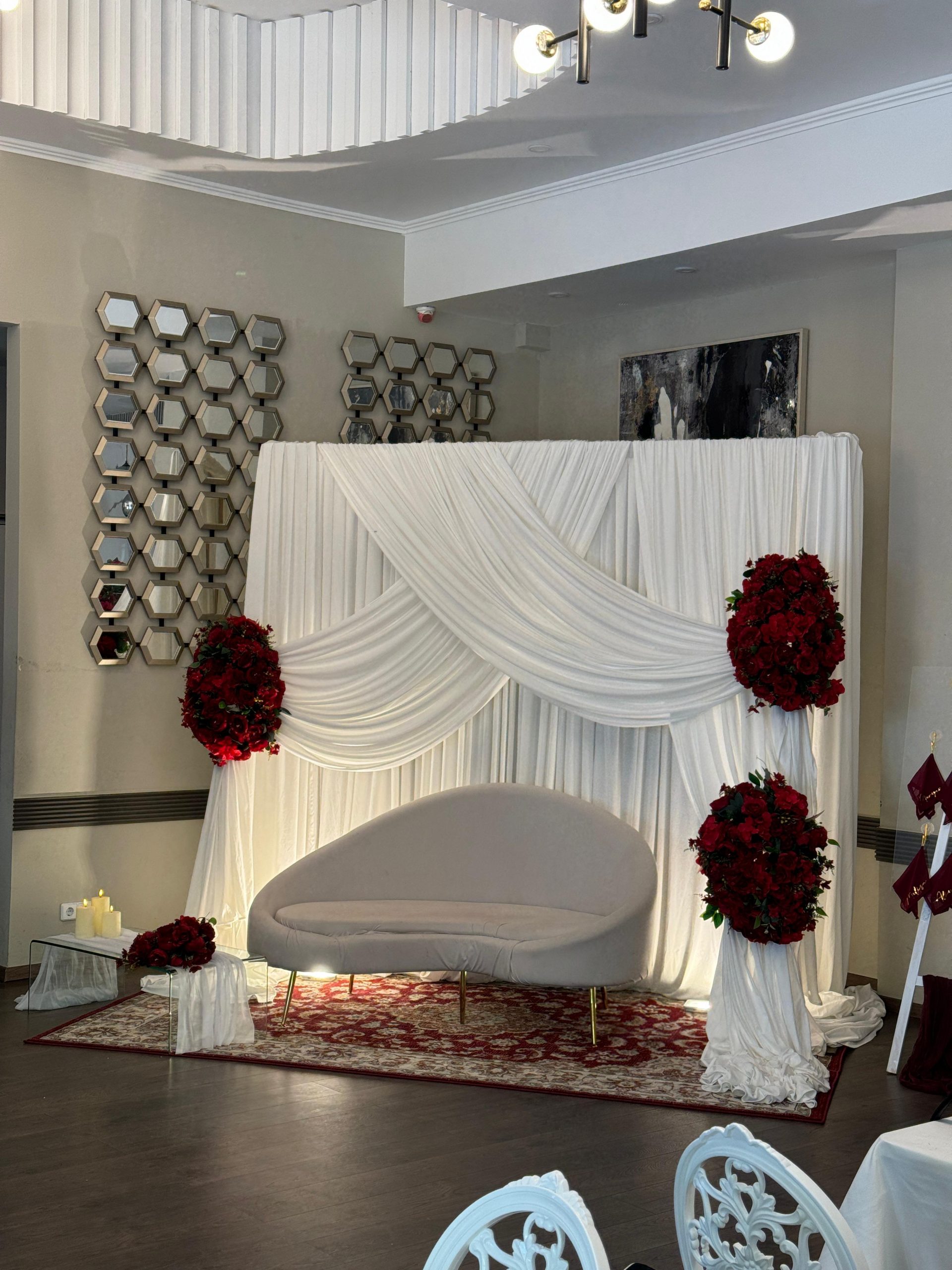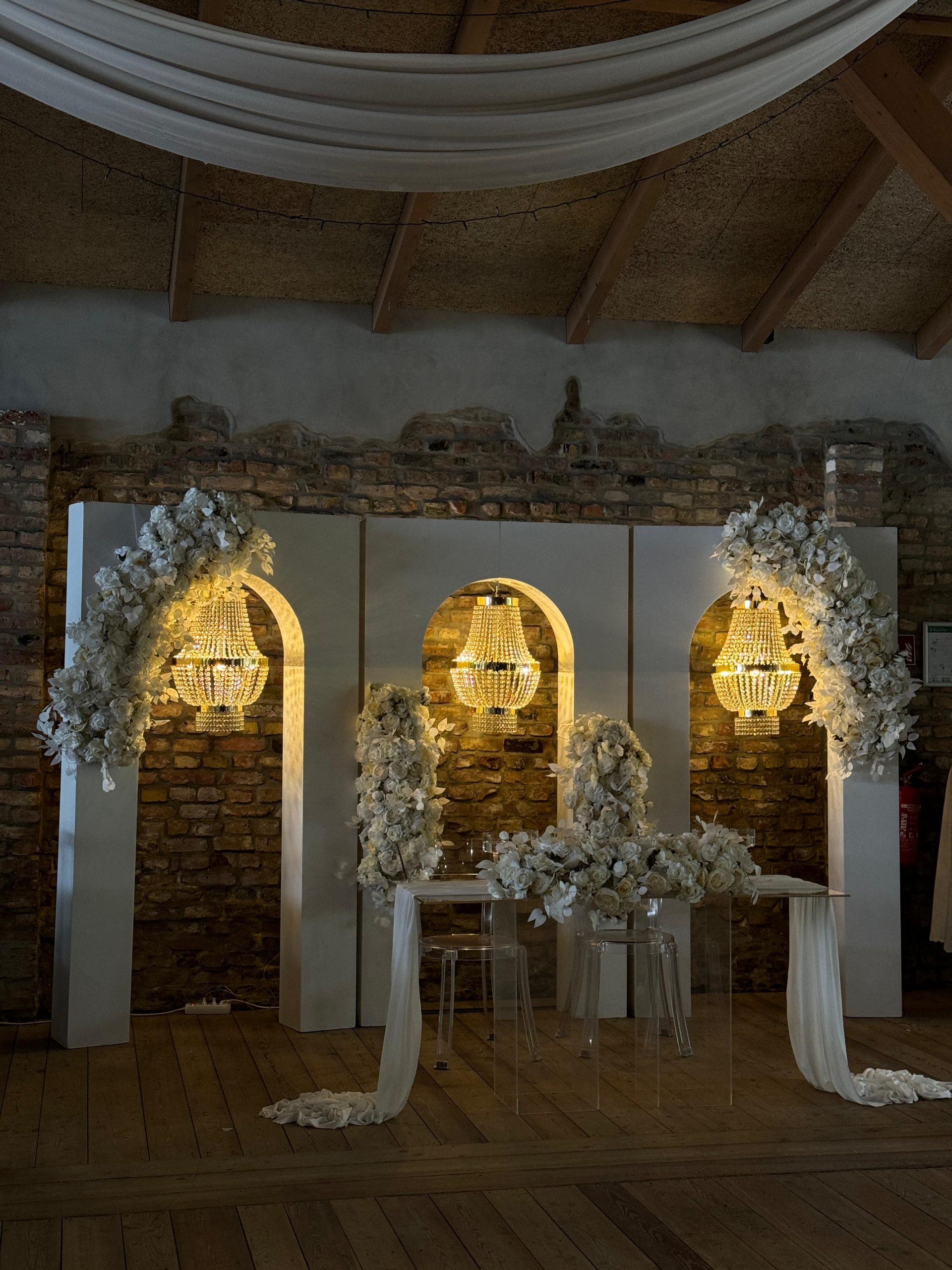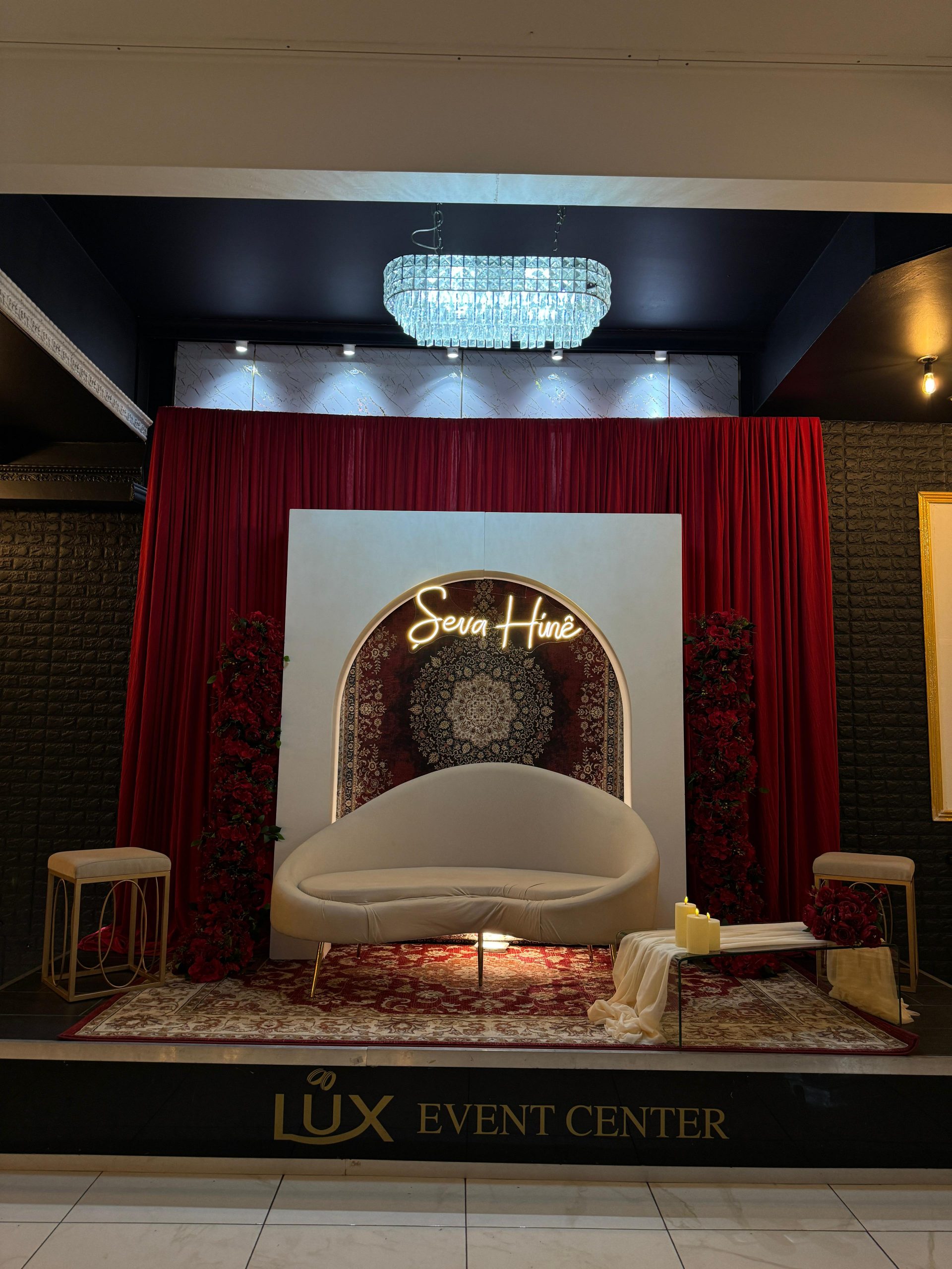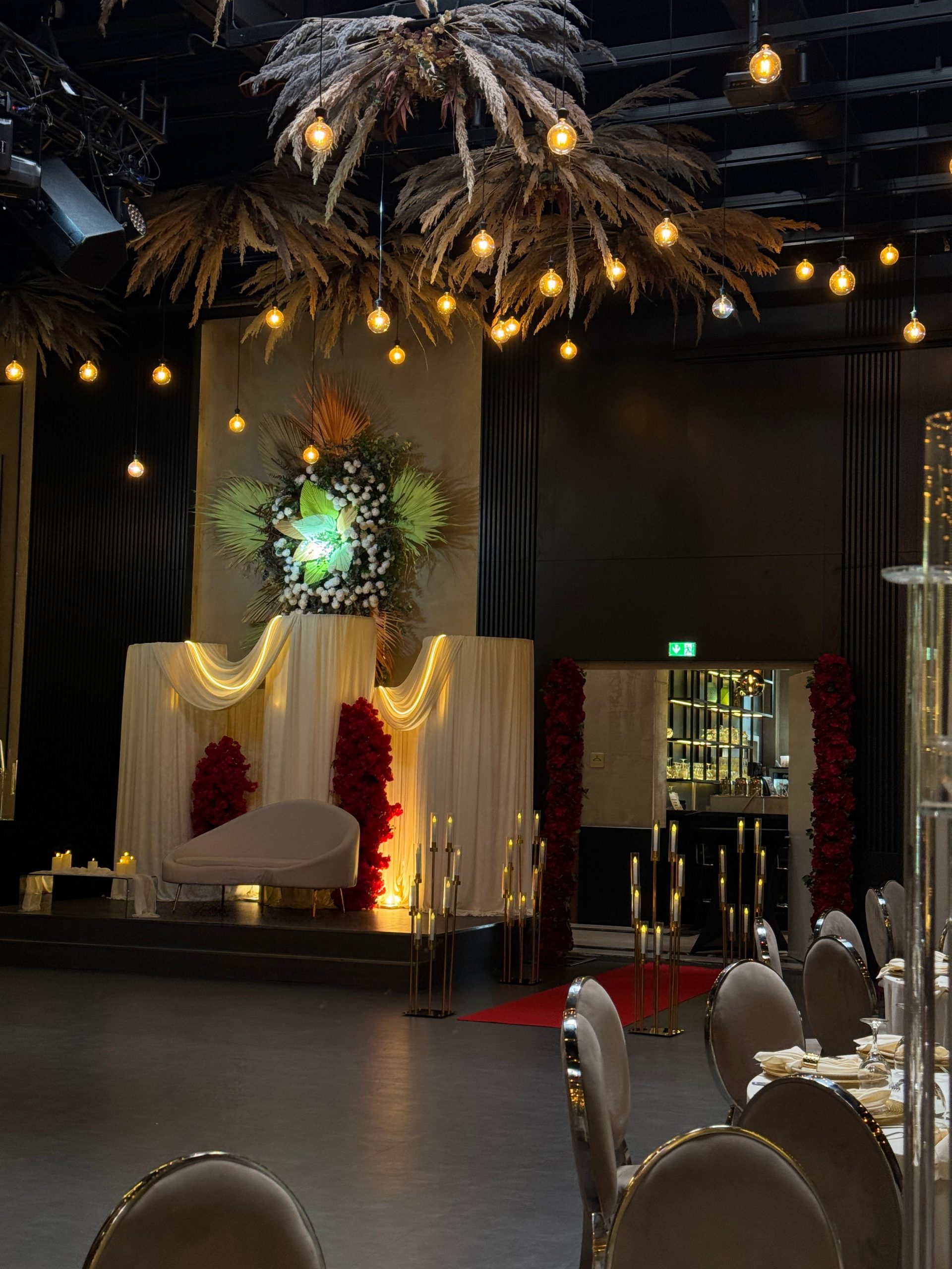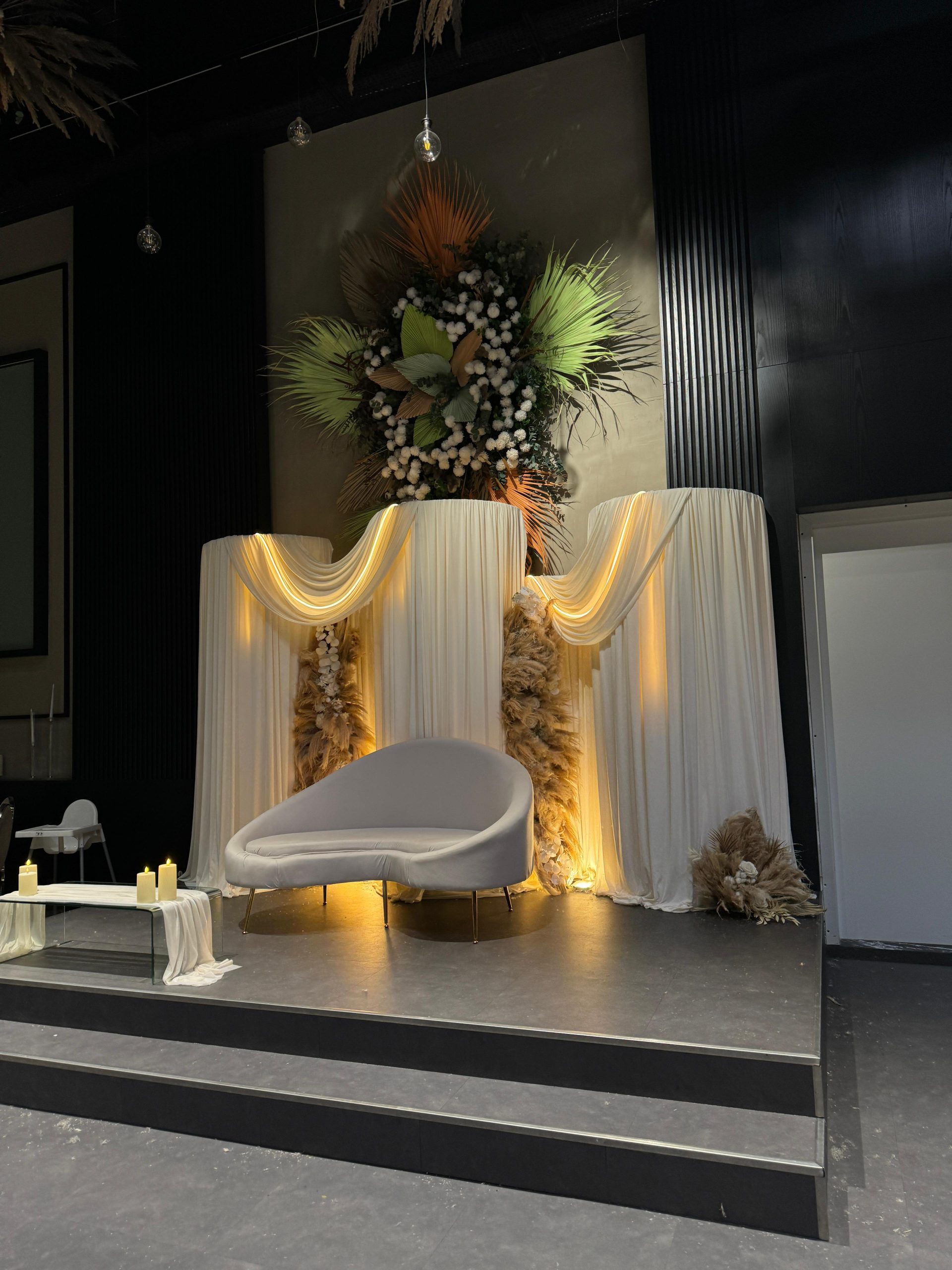 Der Brautpaar-Sitzbereich besteht aus einem stilvoll dekorierten Hintergrund und einer eleganten Sitzmöglichkeit für das Brautpaar. Dabei gestalten wir je nach Wunsch entweder ein Set mit großem Tisch und zwei Stühlen, sodass das Paar während der Feier entspannt essen und trinken kann, oder ein Set mit edler Couch und Beistelltisch, das eine besonders gemütliche und zugleich festliche Atmosphäre schafft.