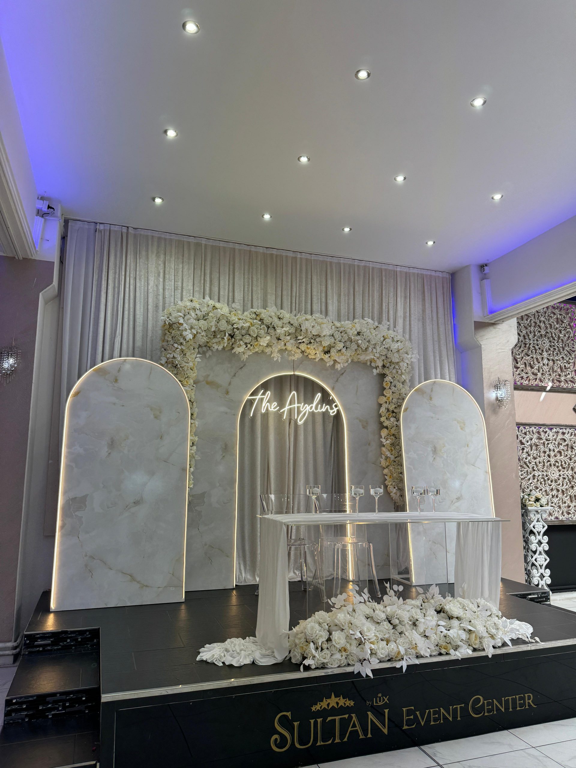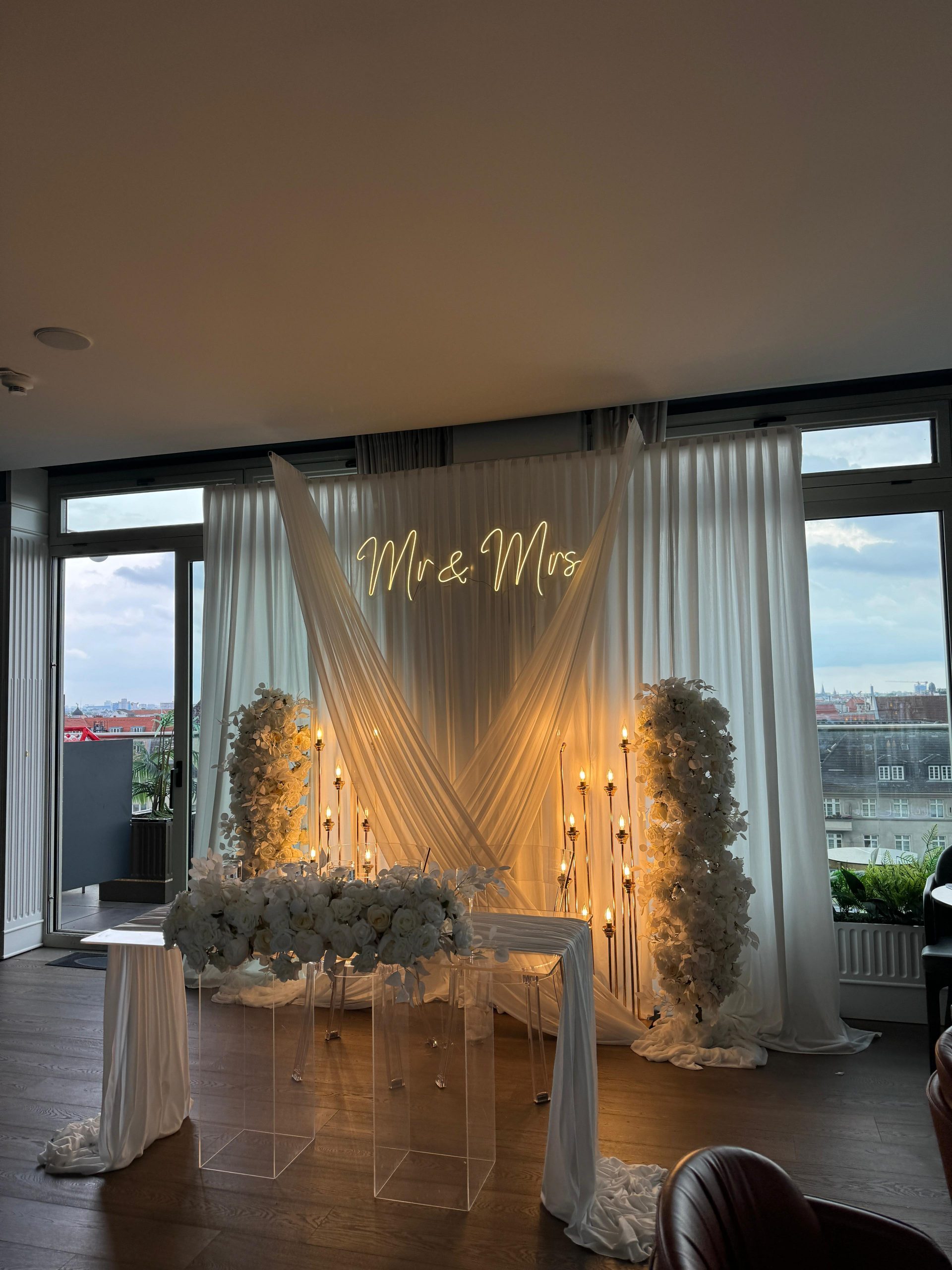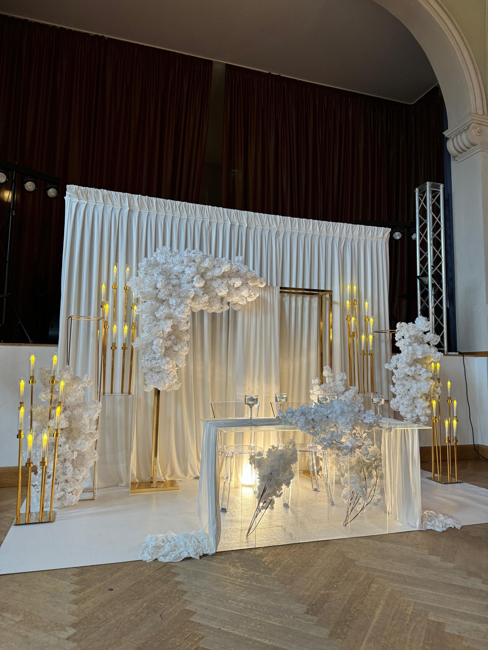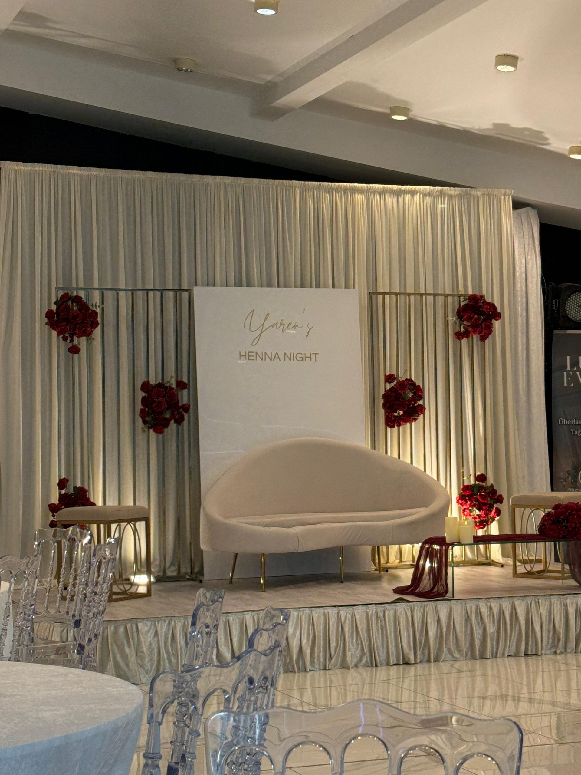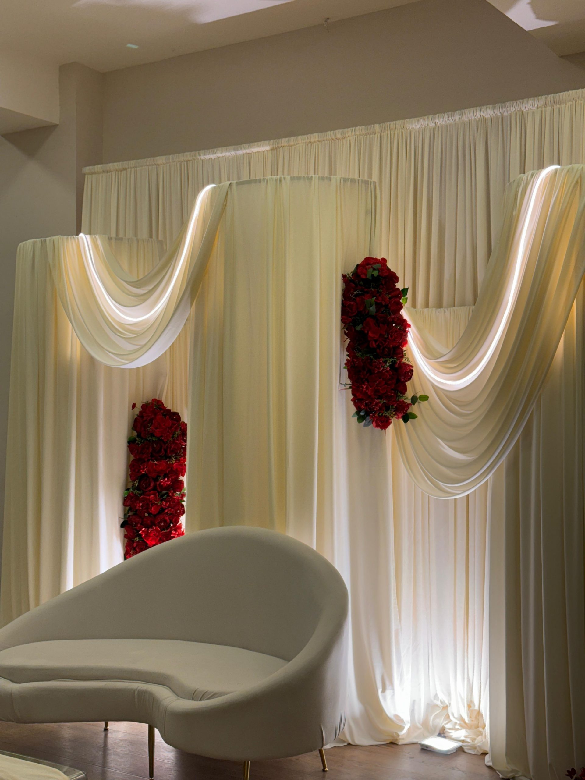 Der Brautpaar-Sitzbereich besteht aus einem stilvoll dekorierten Hintergrund und einer eleganten Sitzmöglichkeit für das Brautpaar. Dabei gestalten wir je nach Wunsch entweder ein Set mit großem Tisch und zwei Stühlen, sodass das Paar während der Feier entspannt essen und trinken kann, oder ein Set mit edler Couch und Beistelltisch, das eine besonders gemütliche und zugleich festliche Atmosphäre schafft.