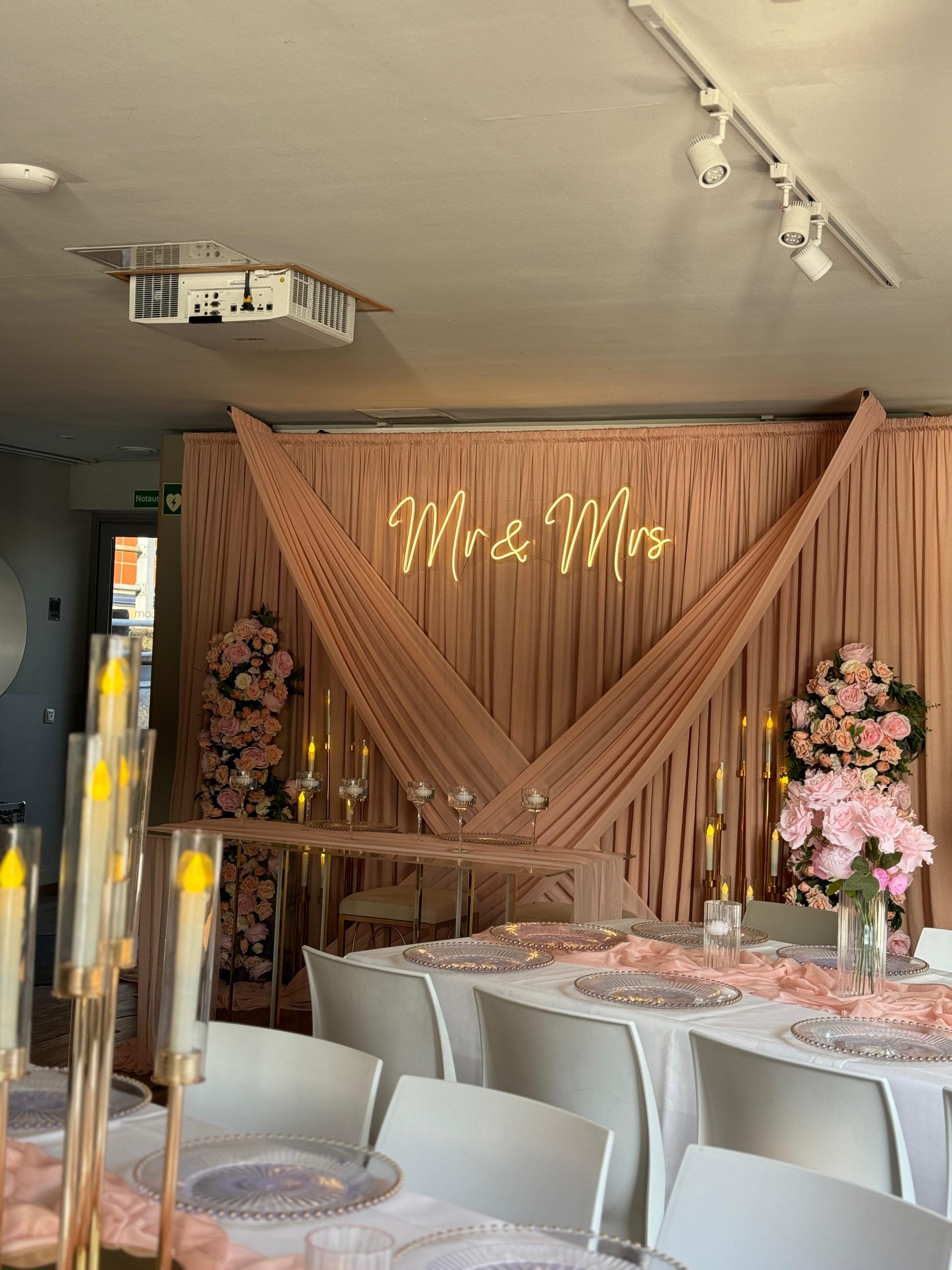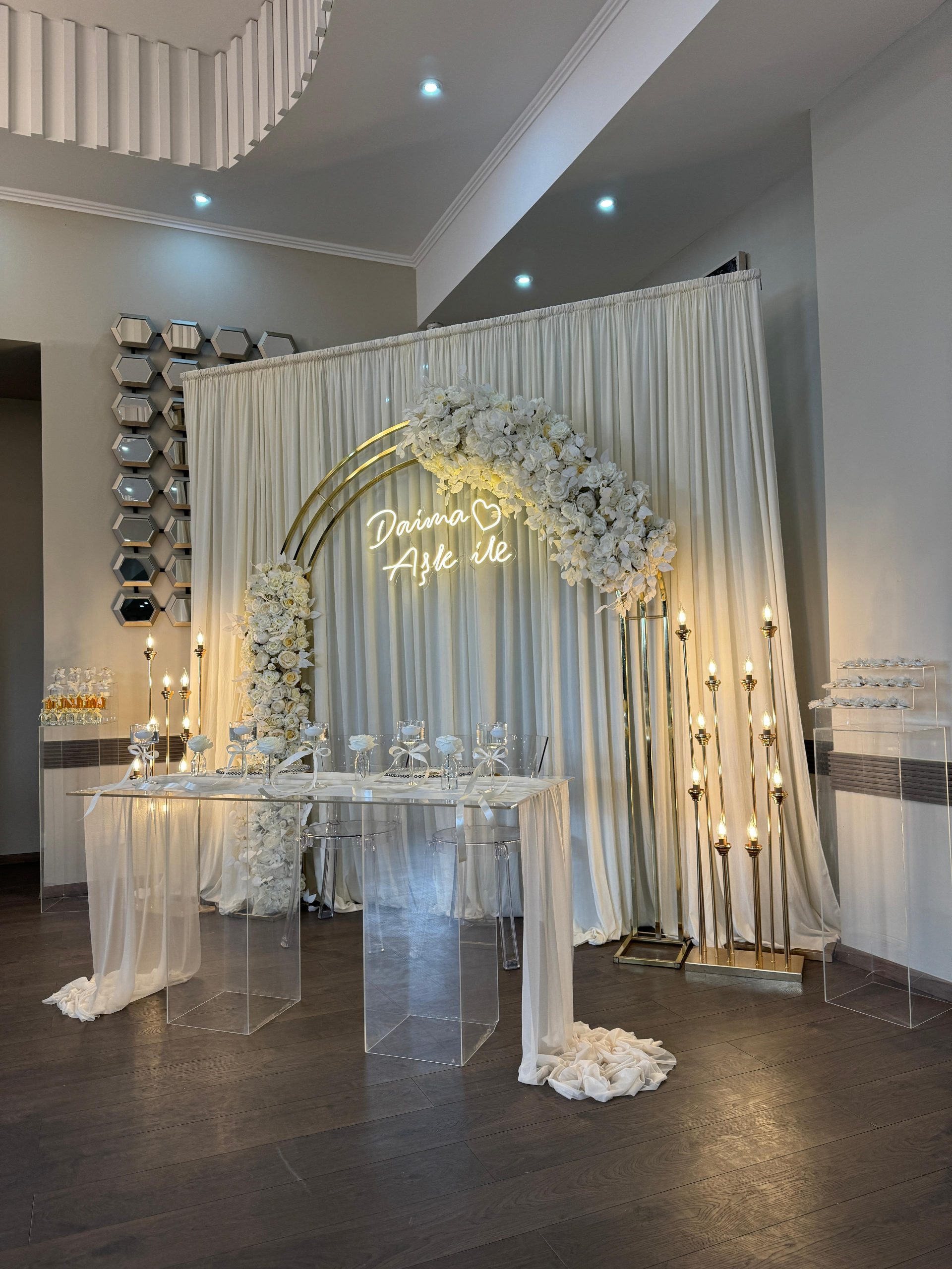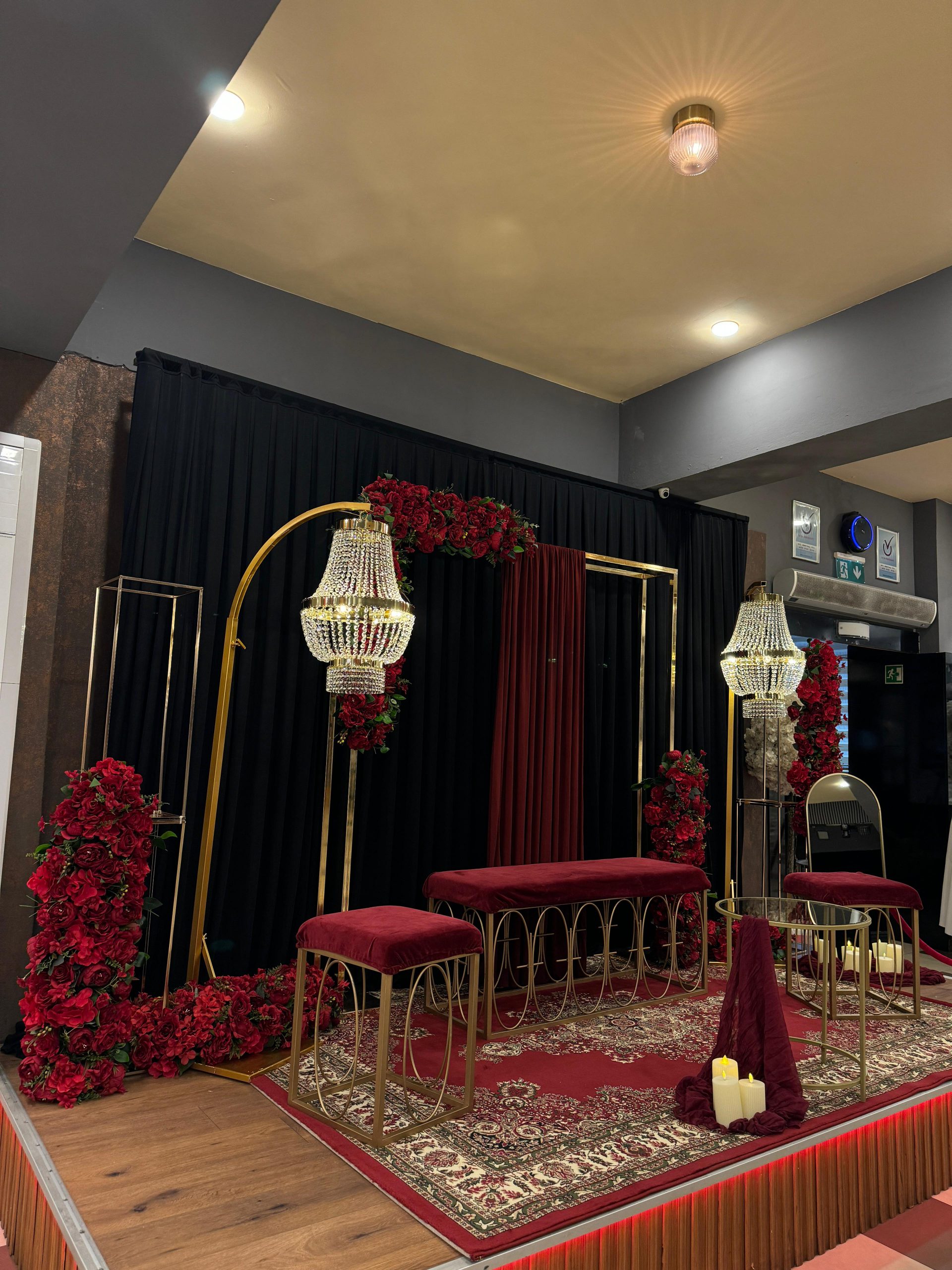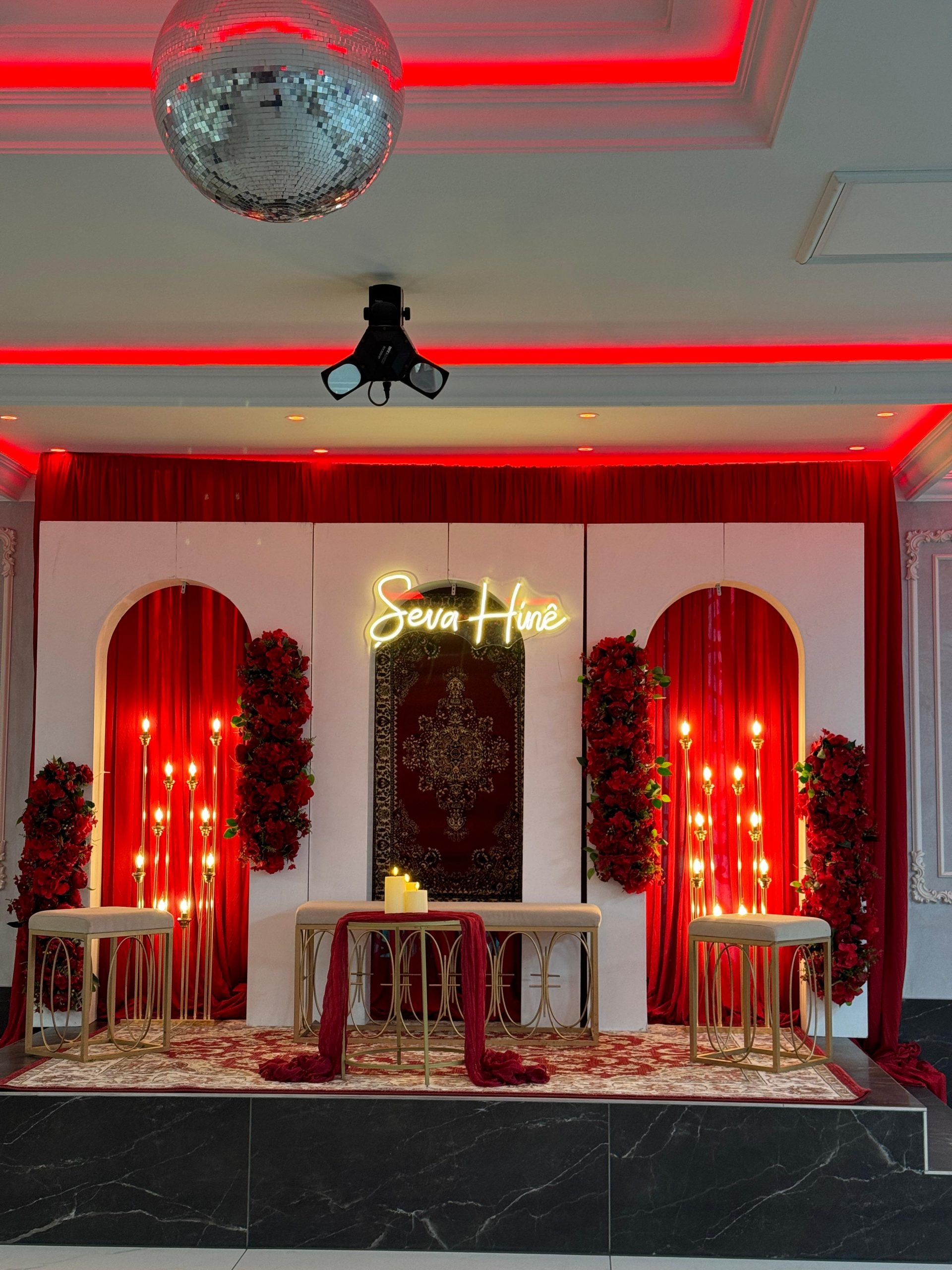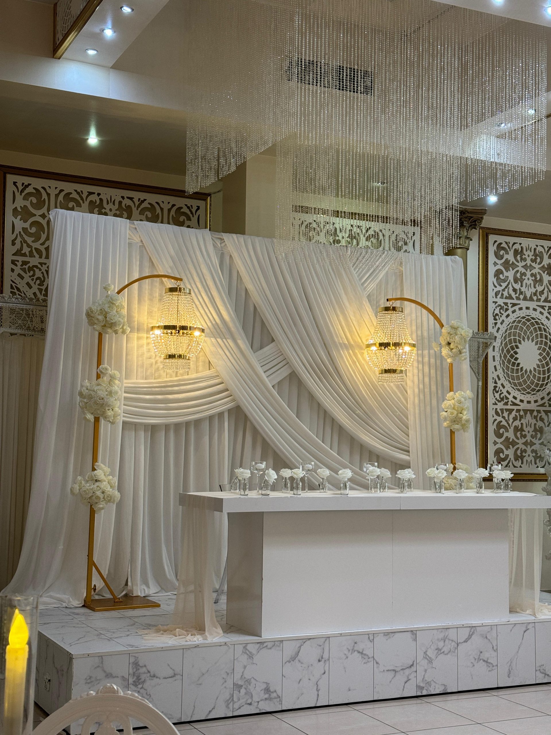 Der Brautpaar-Sitzbereich besteht aus einem stilvoll dekorierten Hintergrund und einer eleganten Sitzmöglichkeit für das Brautpaar. Dabei gestalten wir je nach Wunsch entweder ein Set mit großem Tisch und zwei Stühlen, sodass das Paar während der Feier entspannt essen und trinken kann, oder ein Set mit edler Couch und Beistelltisch, das eine besonders gemütliche und zugleich festliche Atmosphäre schafft.
