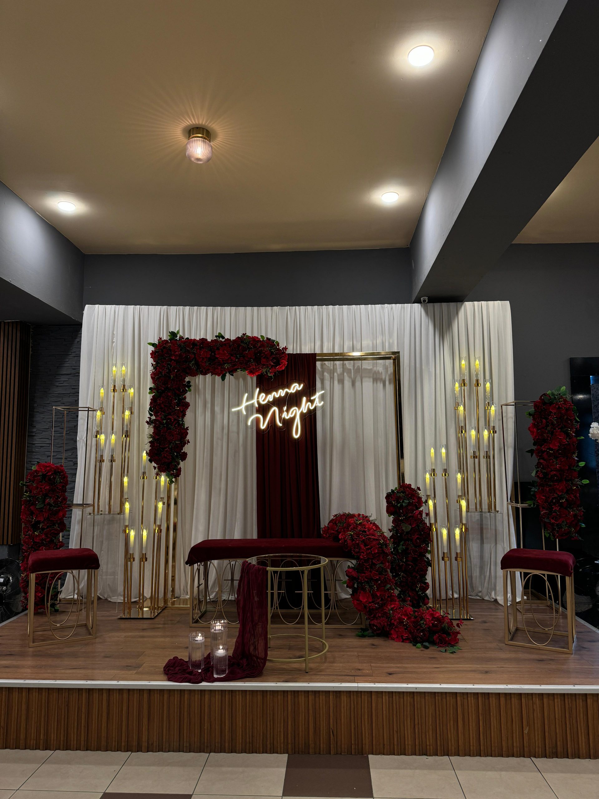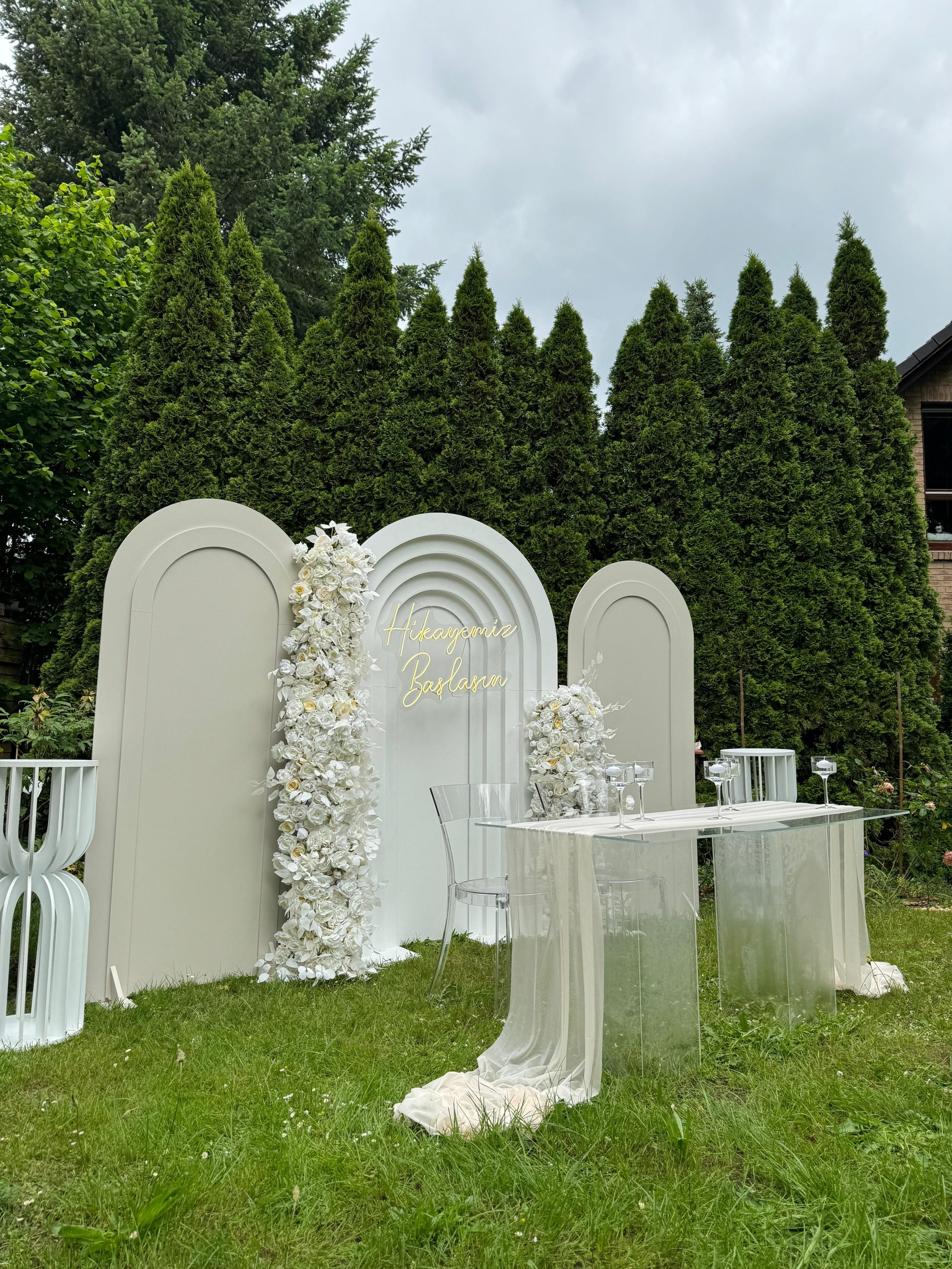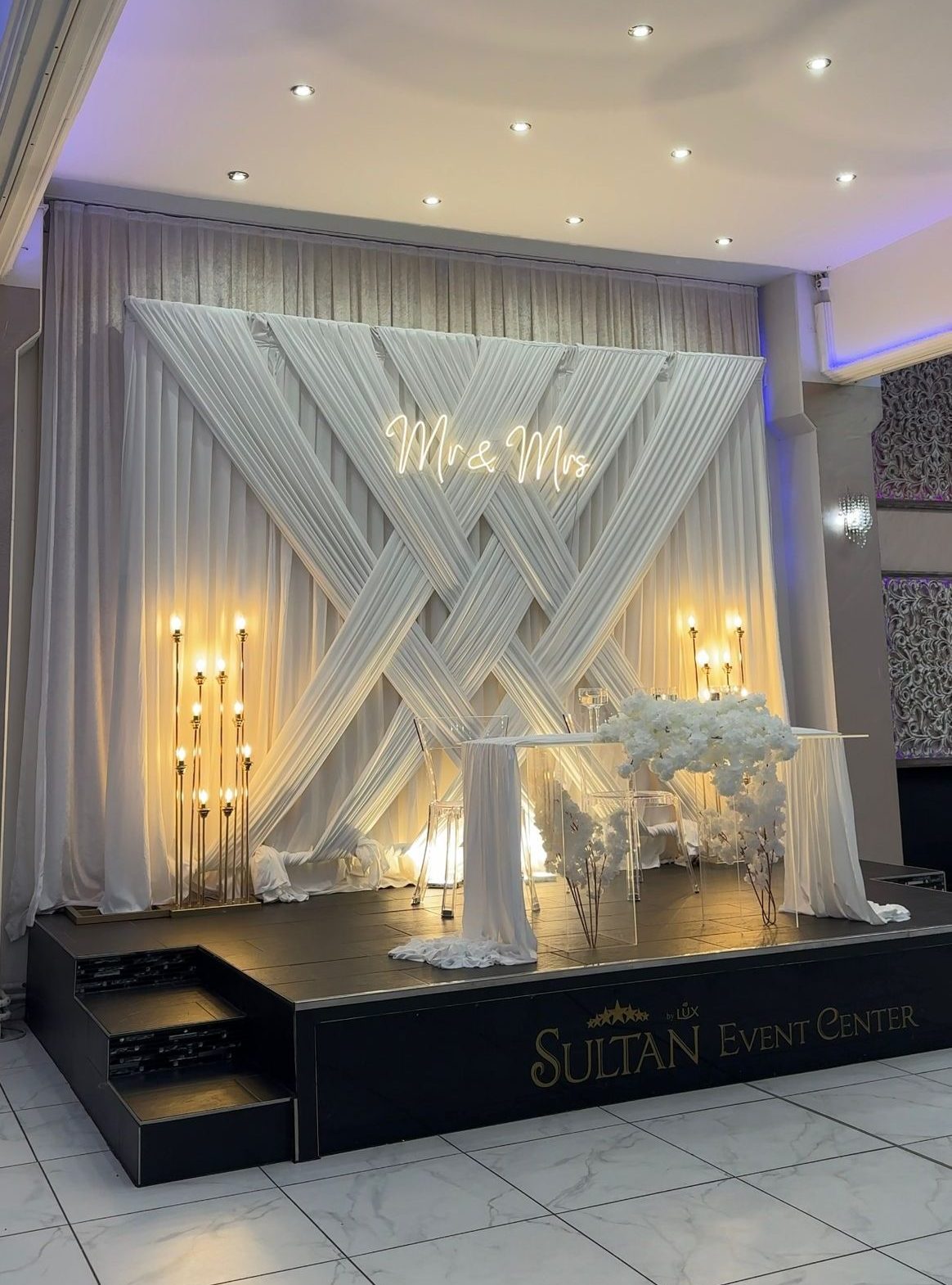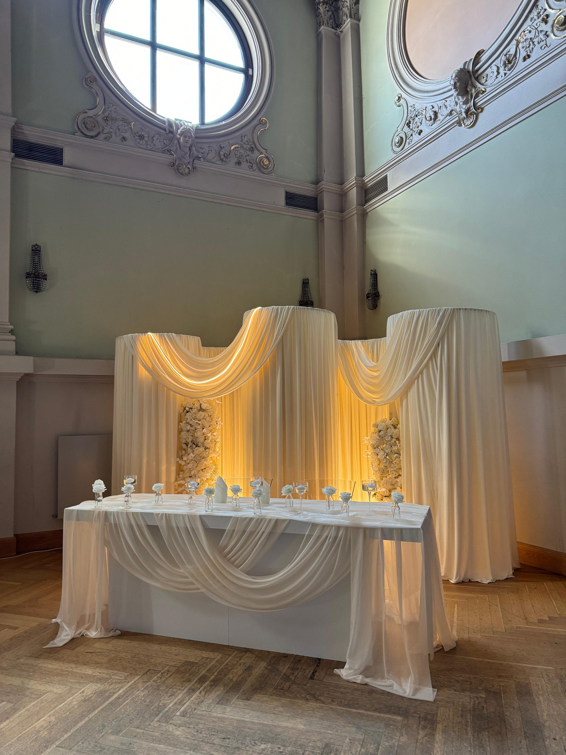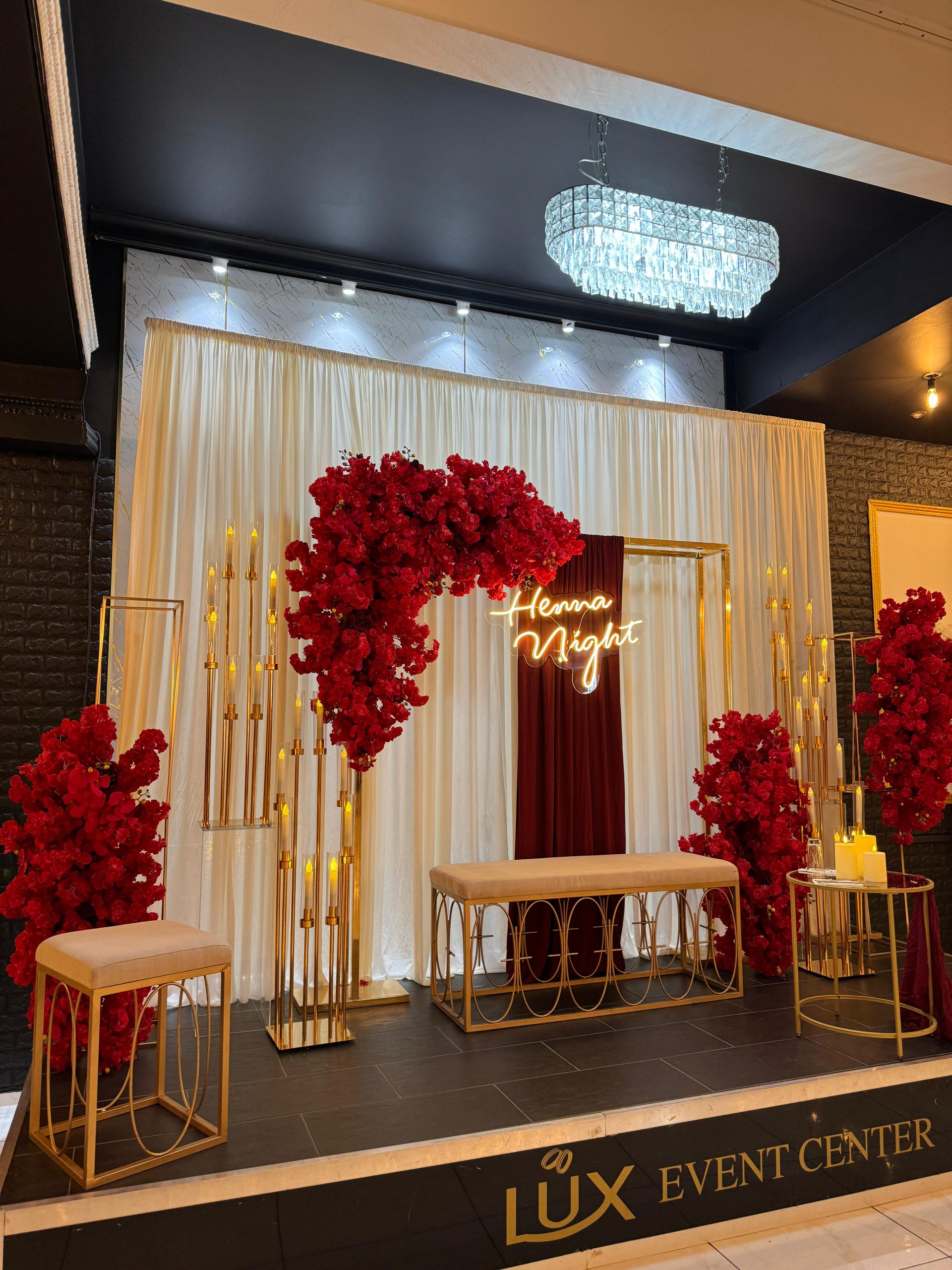 Der Brautpaar-Sitzbereich besteht aus einem stilvoll dekorierten Hintergrund und einer eleganten Sitzmöglichkeit für das Brautpaar. Dabei gestalten wir je nach Wunsch entweder ein Set mit großem Tisch und zwei Stühlen, sodass das Paar während der Feier entspannt essen und trinken kann, oder ein Set mit edler Couch und Beistelltisch, das eine besonders gemütliche und zugleich festliche Atmosphäre schafft.