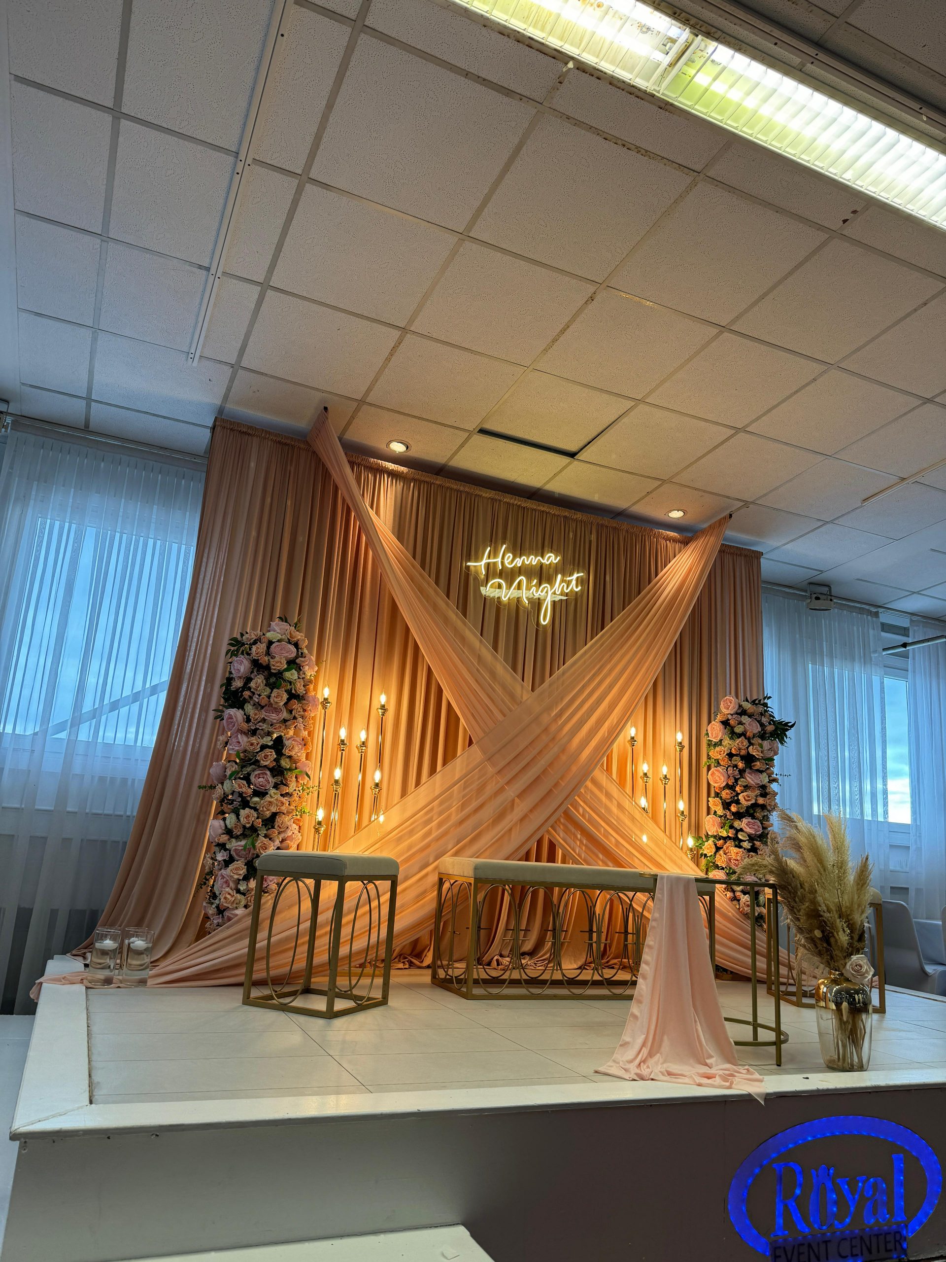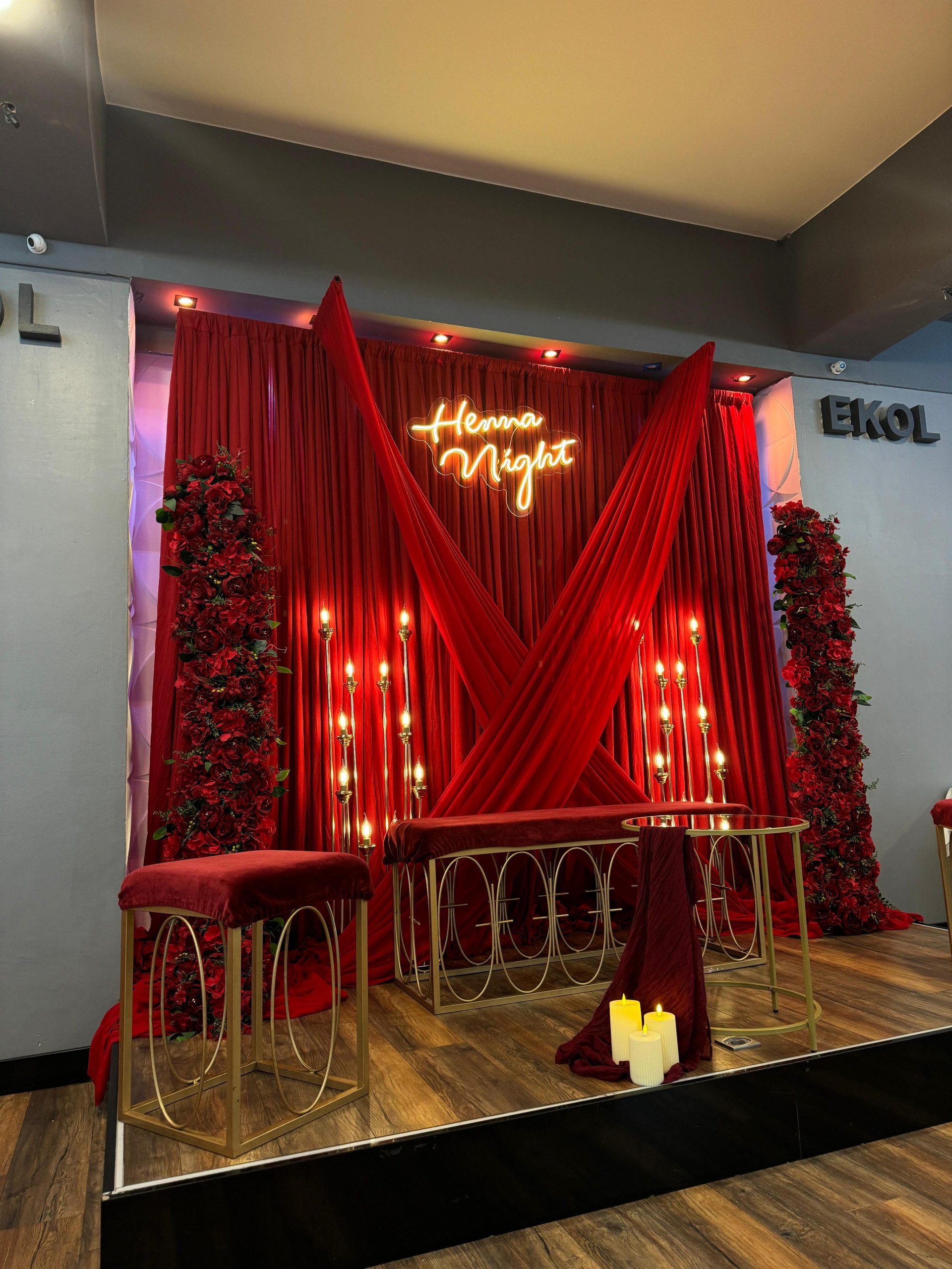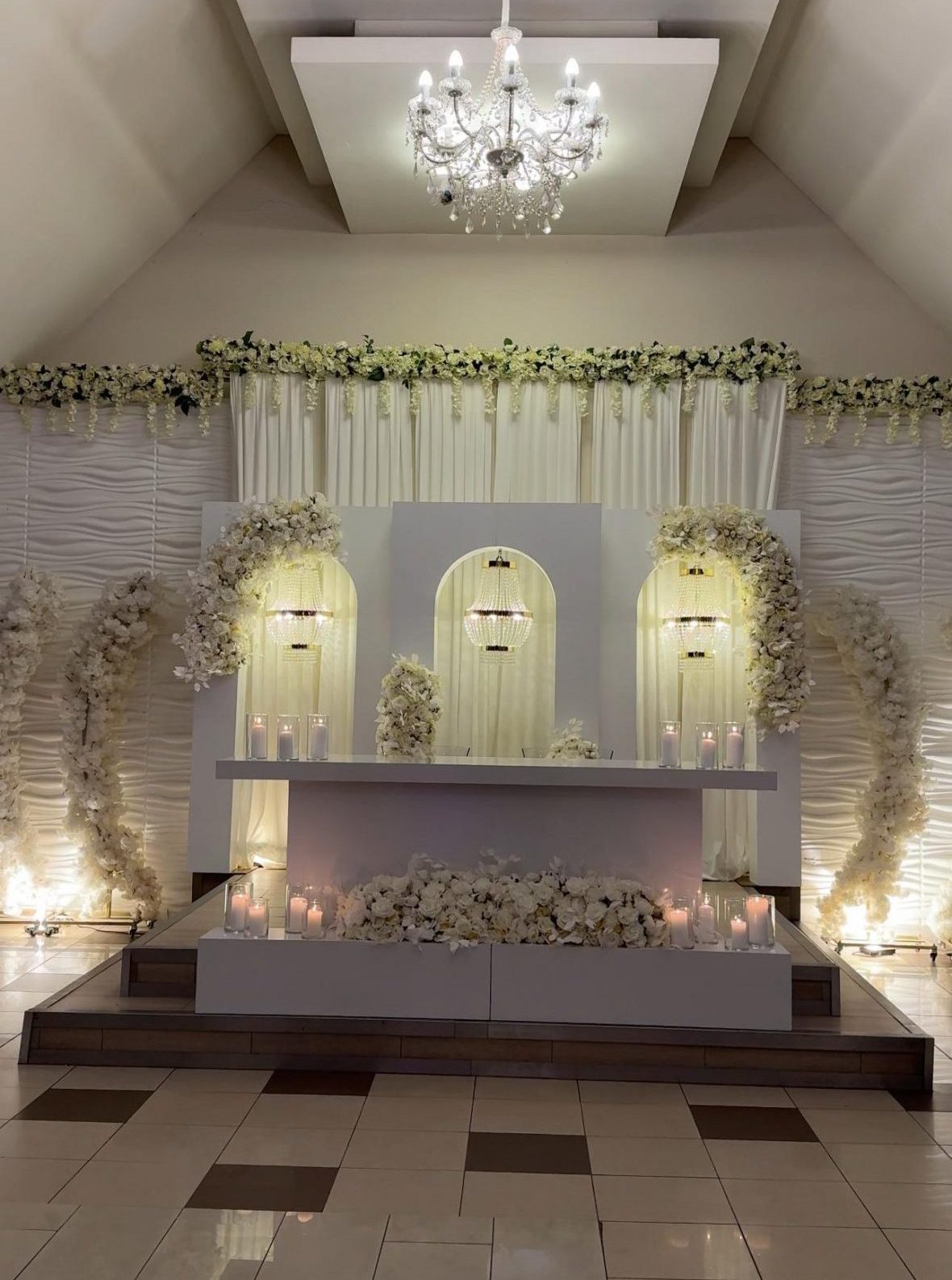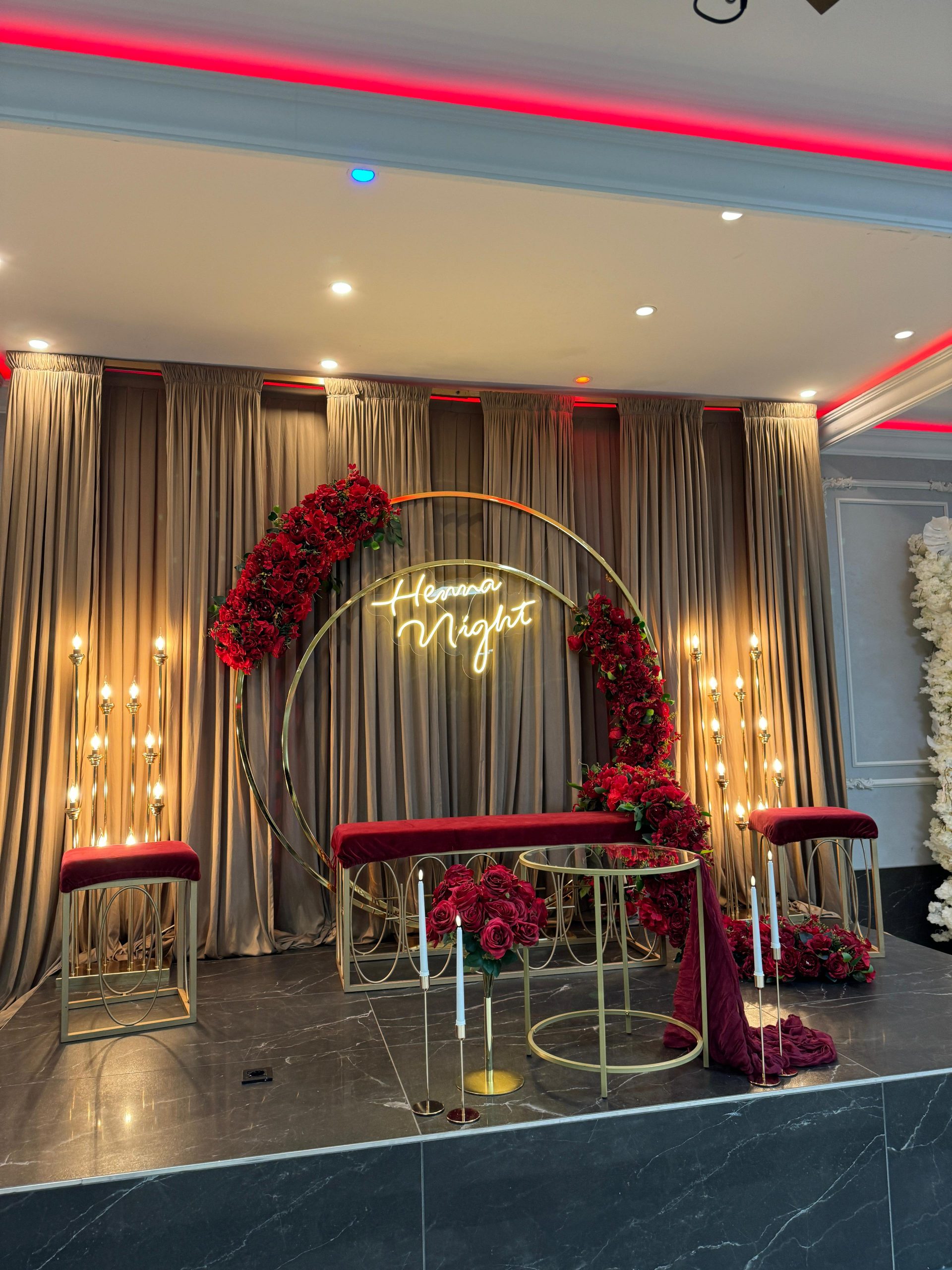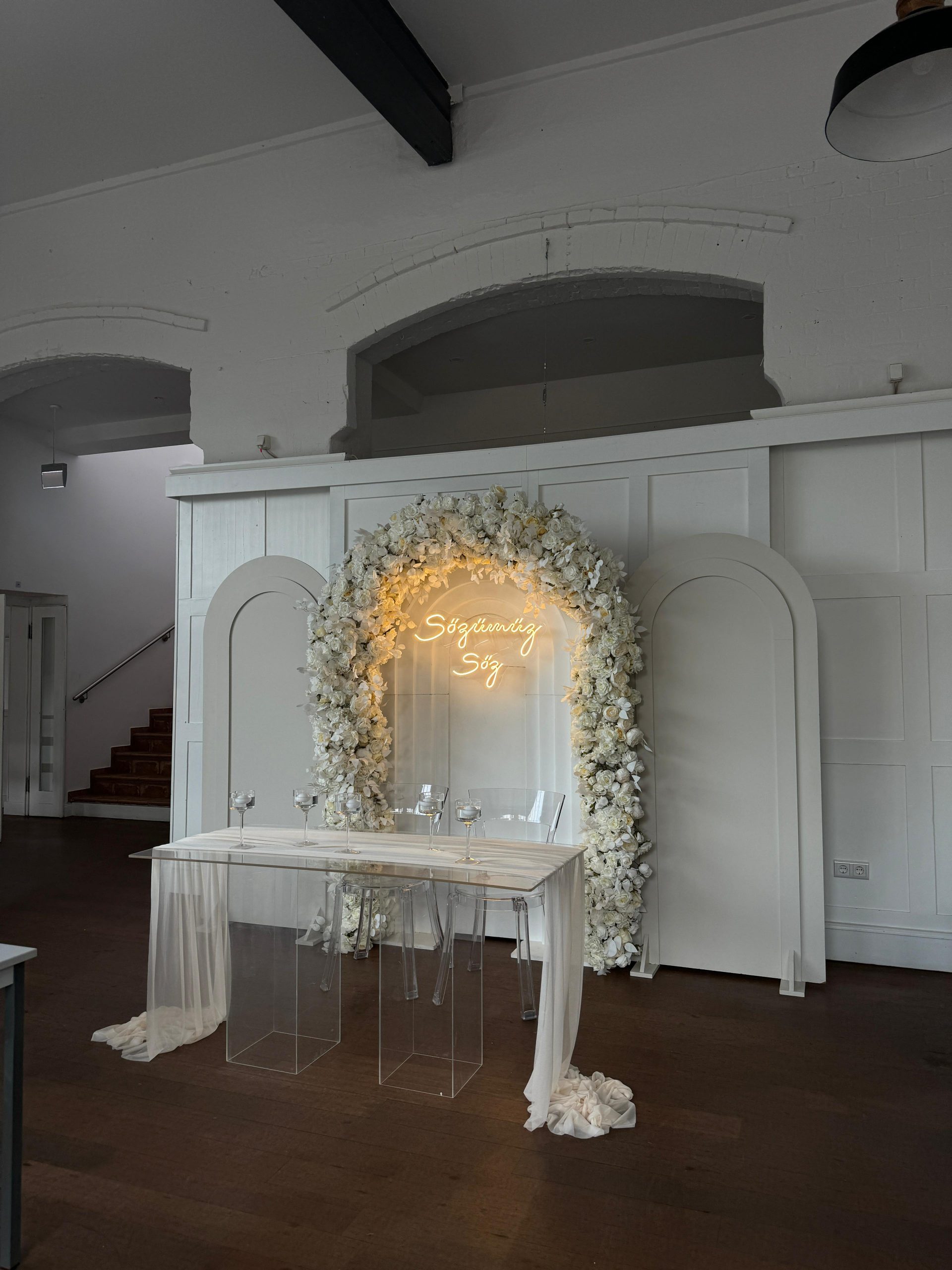 Der Brautpaar-Sitzbereich besteht aus einem stilvoll dekorierten Hintergrund und einer eleganten Sitzmöglichkeit für das Brautpaar. Dabei gestalten wir je nach Wunsch entweder ein Set mit großem Tisch und zwei Stühlen, sodass das Paar während der Feier entspannt essen und trinken kann, oder ein Set mit edler Couch und Beistelltisch, das eine besonders gemütliche und zugleich festliche Atmosphäre schafft.