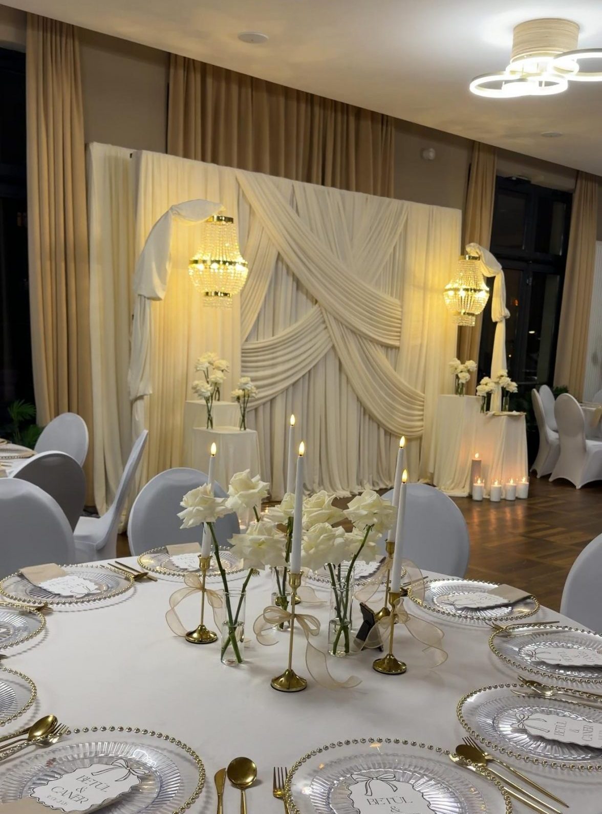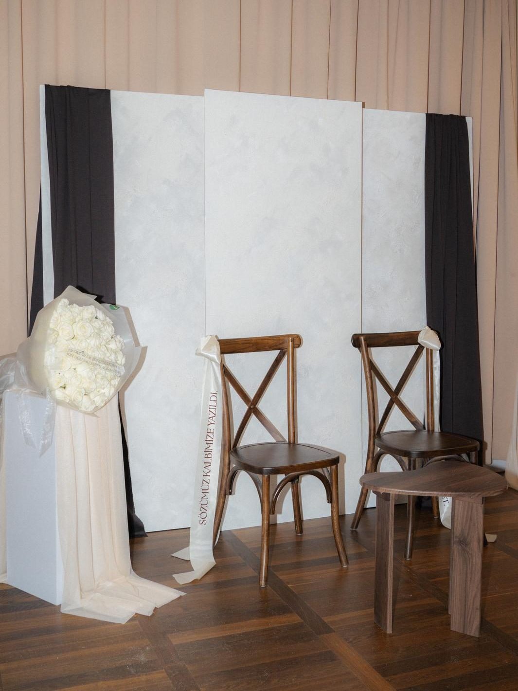Der Brautpaar-Sitzbereich besteht aus einem stilvoll dekorierten Hintergrund und einer eleganten Sitzmöglichkeit für das Brautpaar. Dabei gestalten wir je nach Wunsch entweder ein Set mit großem Tisch und zwei Stühlen, sodass das Paar während der Feier entspannt essen und trinken kann, oder ein Set mit edler Couch und Beistelltisch, das eine besonders gemütliche und zugleich festliche Atmosphäre schafft.