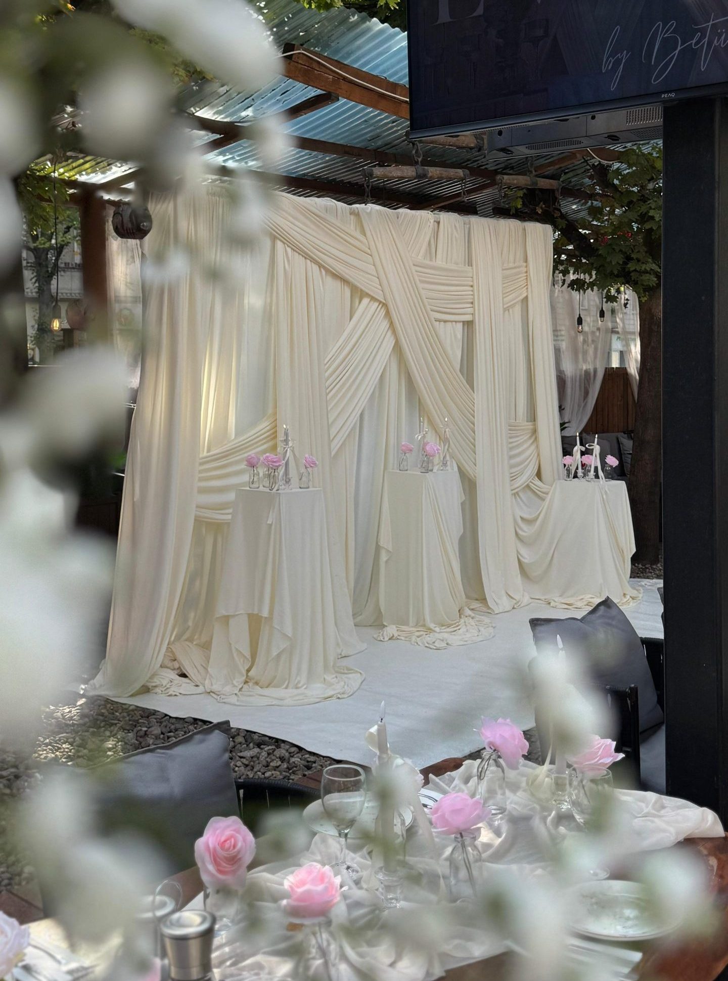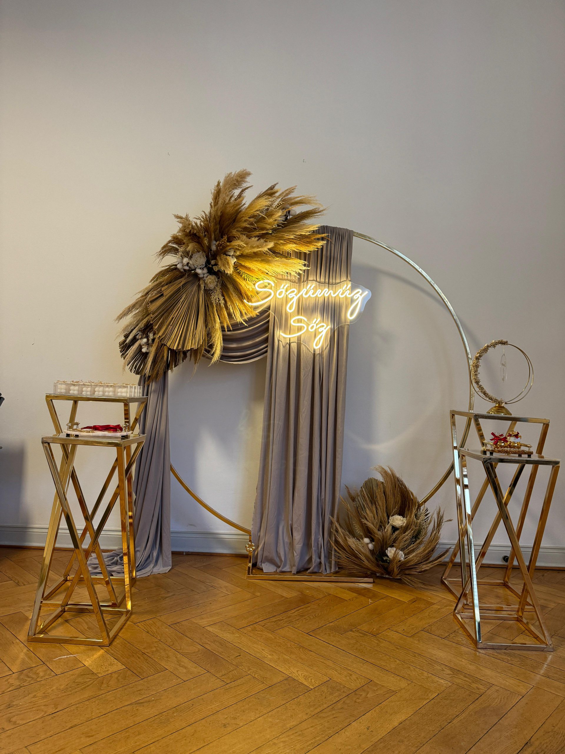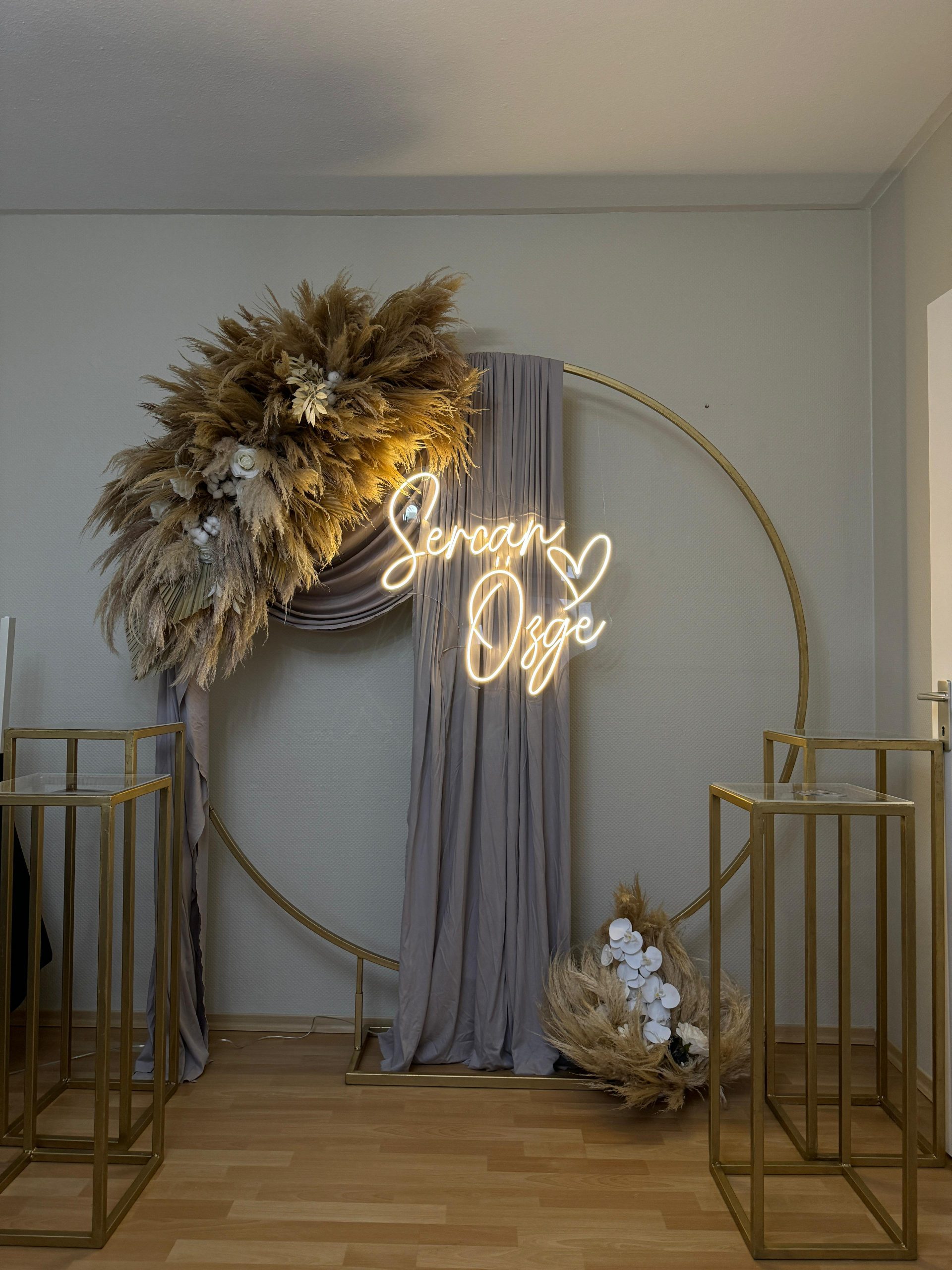 Die Fotoecke besteht aus einem Hintergrund mit länglichen Tischen, auf denen sowohl die Gastgeschenke als auch das Verlobungstablett platziert werden können.