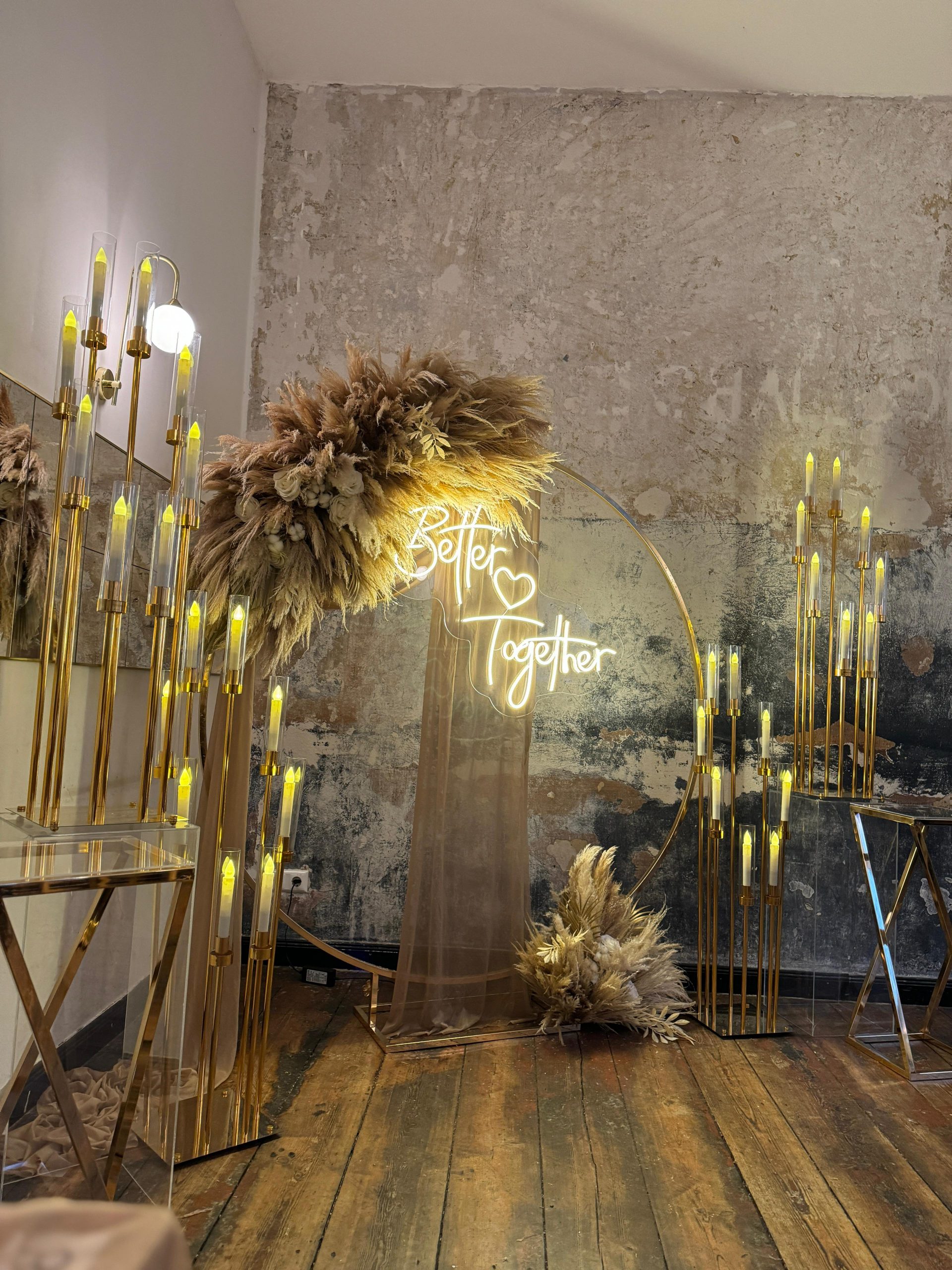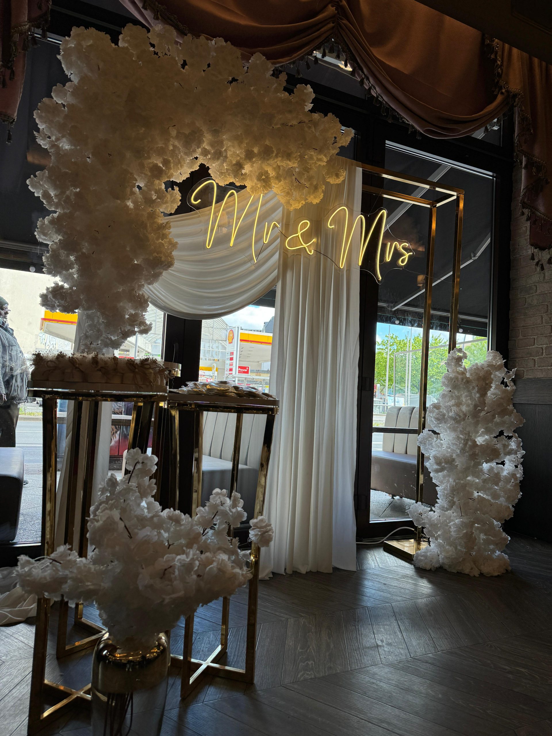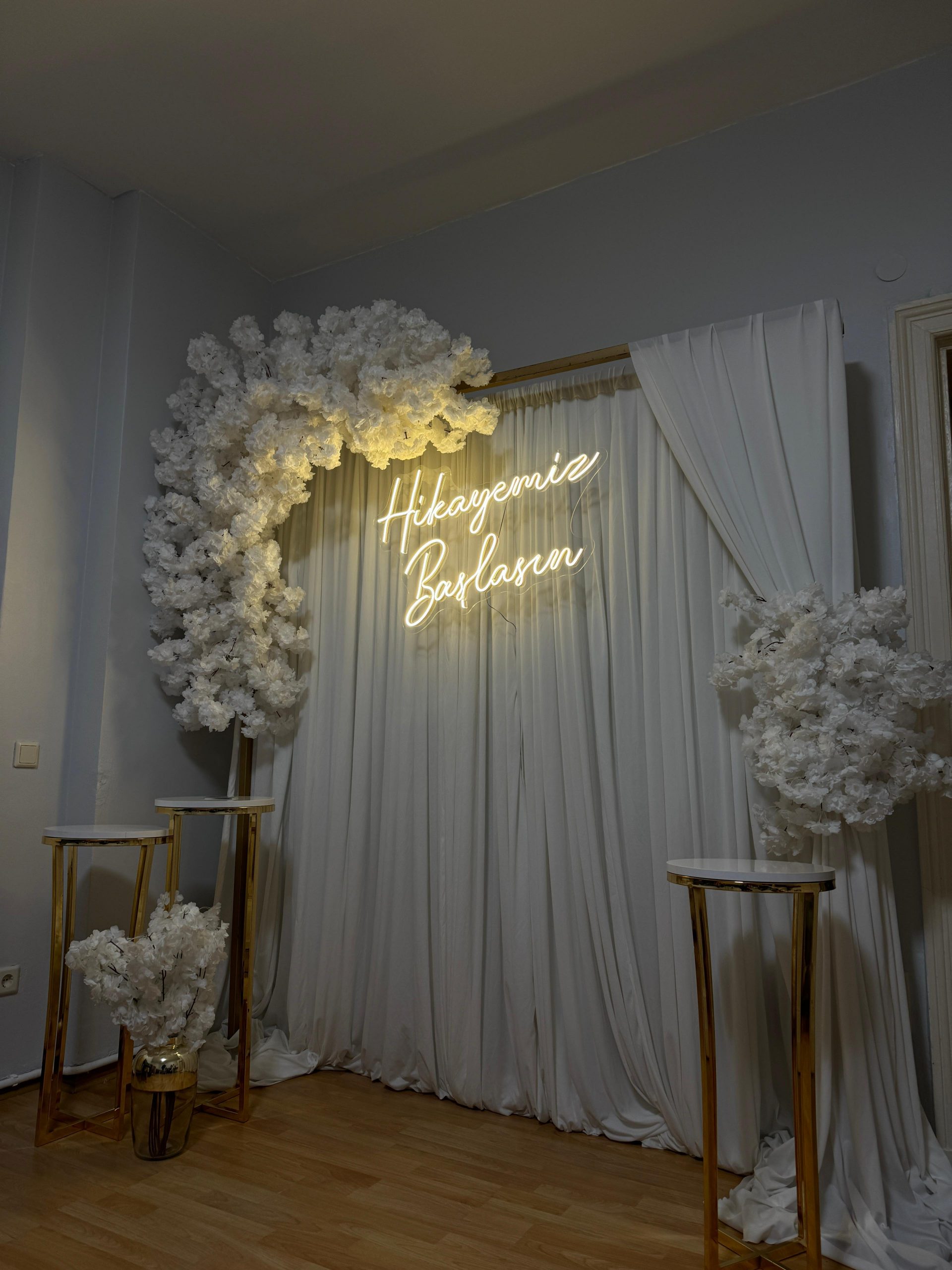 Die Fotoecke besteht aus einem Hintergrund mit länglichen Tischen, auf denen sowohl die Gastgeschenke als auch das Verlobungstablett platziert werden können.