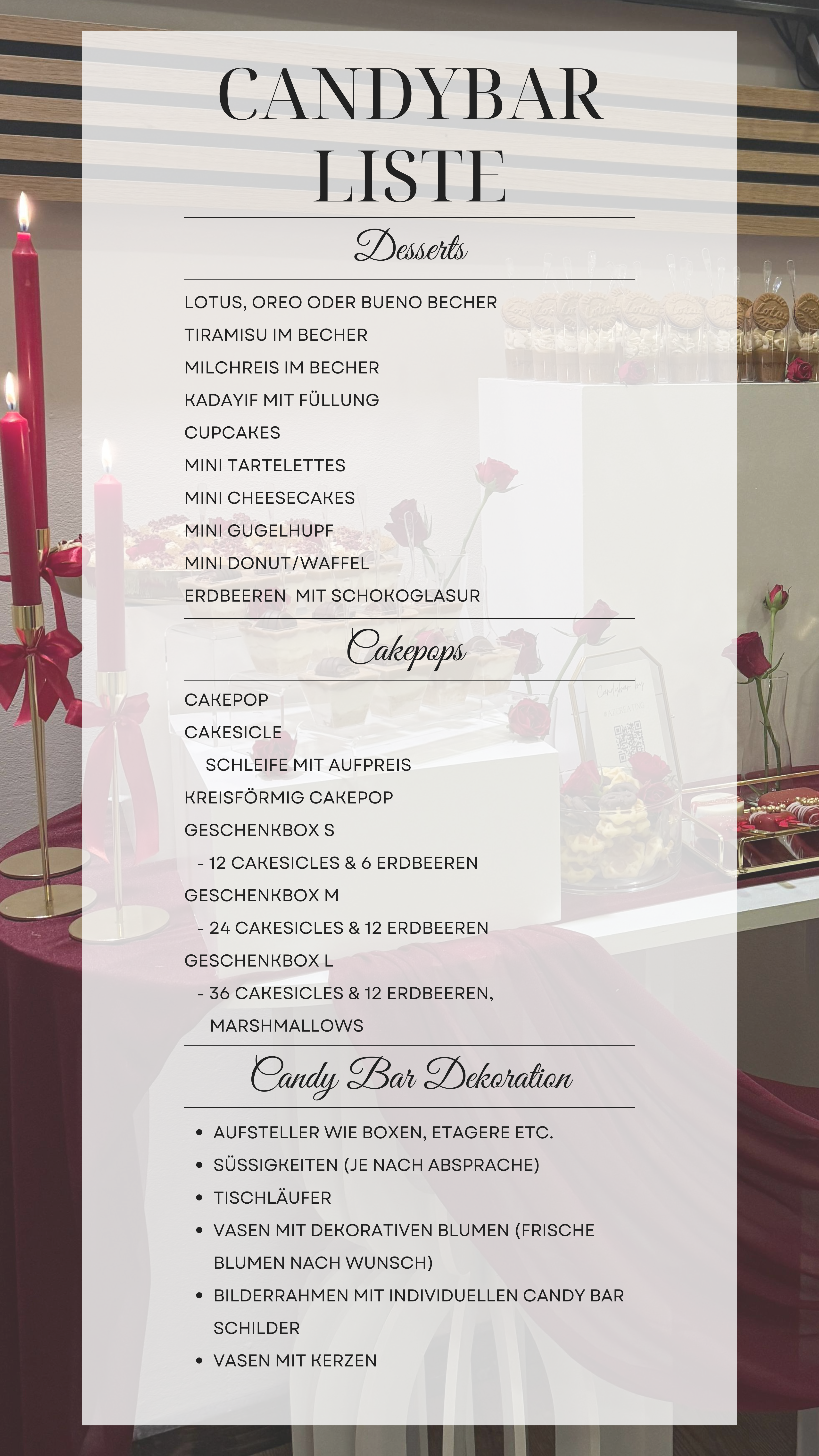 Erlebe eine professionelle Candybar, stilvolle Tisch- und Einladungskarten sowie eine köstliche Auswahl an Desserts, die wir auf Wunsch auch für Selbstabholer anbieten. Perfekt für jedes Event, bei dem du Eleganz und Genuss miteinander verbinden möchtest.